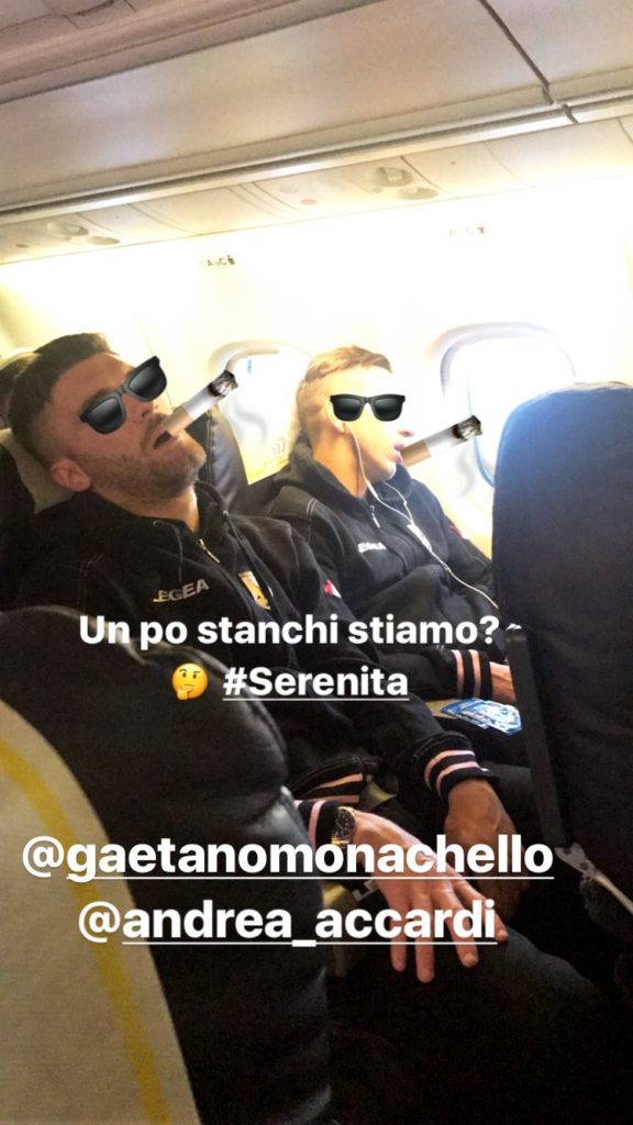Viaggio aereo per i rosanero e qualche giocatore ne approfitta per schiacciare un pisolino. Come Gaetano Monachello e Andrea Accardi, compagni di seggiolino e anche di…sonno. I due rosanero si riposano e Gnahoré ne approfitta per divertirsi un po’.