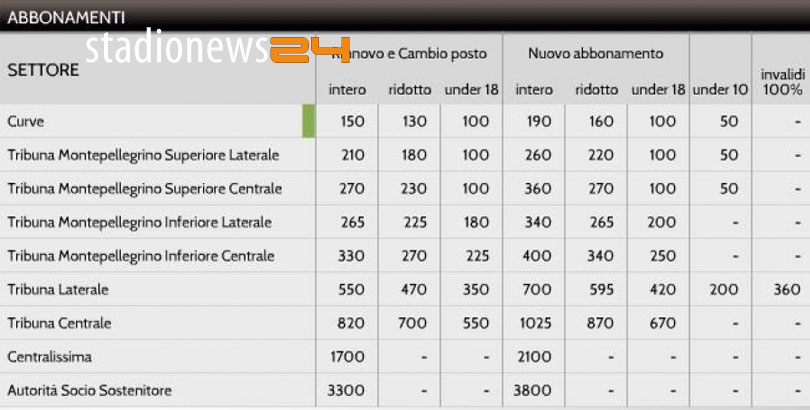 Per tutti i settori (tranne Tribuna Autorità Socio Sostenitore) è previsto anche uno sconto per le donne e gli over 65 (nati prima del 31/12/1950).