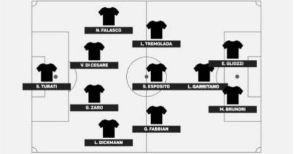 Per il Palermo c’è Matteo Brunori, che fa coppia con Gliozzi. Tra gli assenti più clamorosi c’è Cheddira: si tratta di un 4-3-1-2 con Turati in porta, Dickmann, Zaro, Di Cesare, Falasco in difesa, Fabbian, Esposito, Tremolada a centrocampo, Garritano trequartista, Gliozzi e Brunori in attacco.