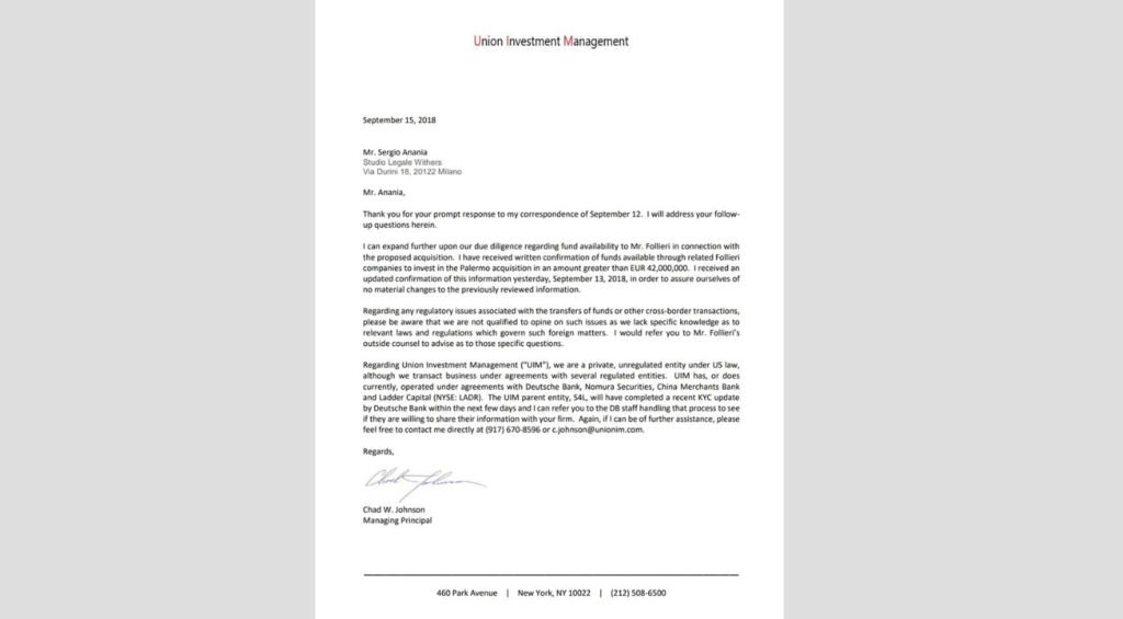 L’imprenditore foggiano ha poi citato nel comunicato altri due documenti che sarebbero alla base delle trattative portate avanti con Zamparini: una lettera di referenze datata maggio 2018 (che certificherebbe i rapporti di Anthony Podesta con la Bank of America) e una di evidenza fondi inviata da Chad Johnson all’avvocato Anania il 15 settembre 2018 in merito alla conferma della disponibilità di fondi per acquisire il Palermo calcio.