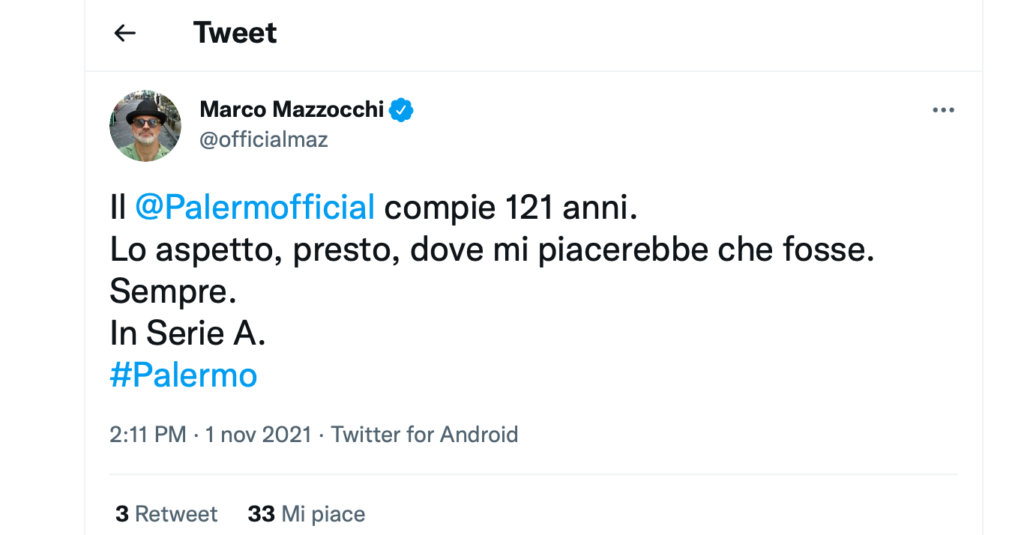 “Il @Palermofficial compie 121 anni. Lo aspetto, presto, dove mi piacerebbe che fosse. Sempre. In Serie A”. Queste le belle parole del giornalista e cronista.