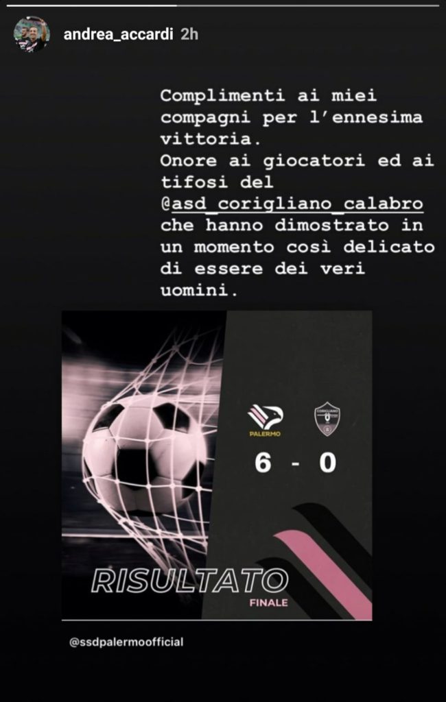 “Uomini veri”. Andrea Accardi si congratula con i propri compagni per la vittoria, ma il suo pensiero va soprattutto al Corigliano e ai suoi tifosi.