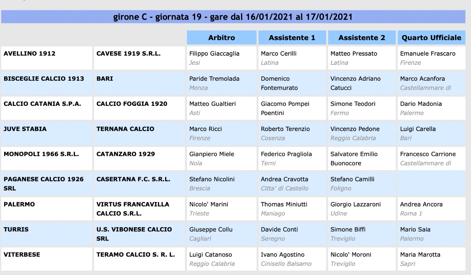 L’AIA ha reso noti i nominativi degli Arbitri, degli Assistenti e dei IV Ufficiali che dirigeranno le gare valide per la 19a giornata di andata del Campionato di Serie C, Girone C, 2020/21 (VEDI FOTO IN ALTO).