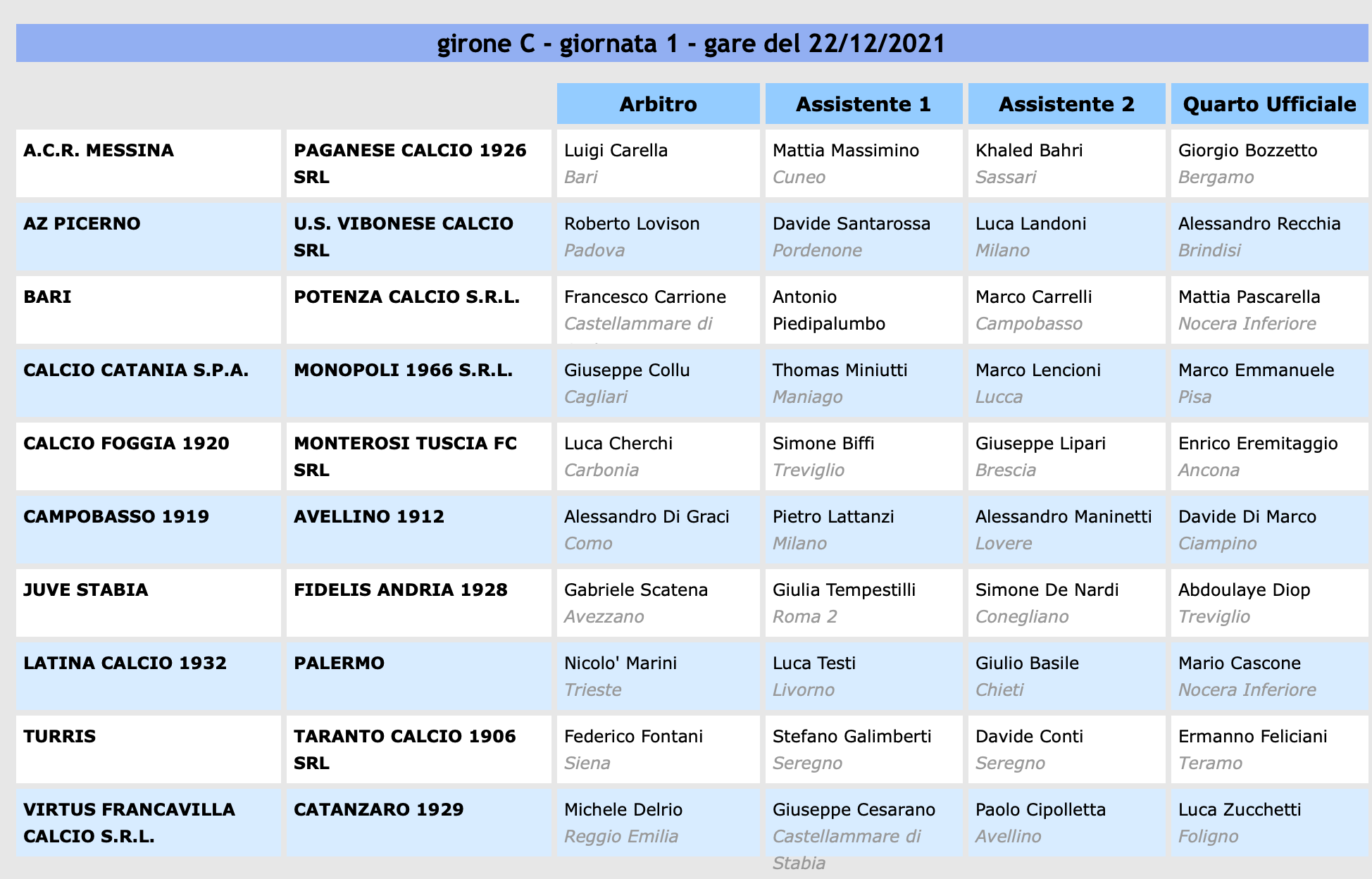 News Serie C Arbitri Serie C girone C, le designazioni della 20a giornata Redazione 20/12/2021 09:48 Sono state rese note dall’Aia le designazioni arbitrali per le partite della 20a giornata di di Serie C (1a di ritorno) (vedi foto in alto).Tags: arbitri 20a giornata serie c, arbitri serie c girone c, Arbitri Serie C girone C bari, Arbitri Serie C girone C catania, Arbitri Serie C girone C designazioni, Arbitri Serie C girone C palermo Continue ReadingPrevious Messina – Catania 2 – 2, gli highlights / VIDEONext Lecce – Vicenza: dove vederla in diretta tv e streaming, orario d’inizio COMMENTA / VAI AI COMMENTILascia un commento Annulla rispostaIl tuo indirizzo email non sarà pubblicato. I campi obbligatori sono contrassegnati *Commento * Nome * Email * Sito web Salva il mio nome, email e sito web in questo browser per la prossima volta che commento. Δ