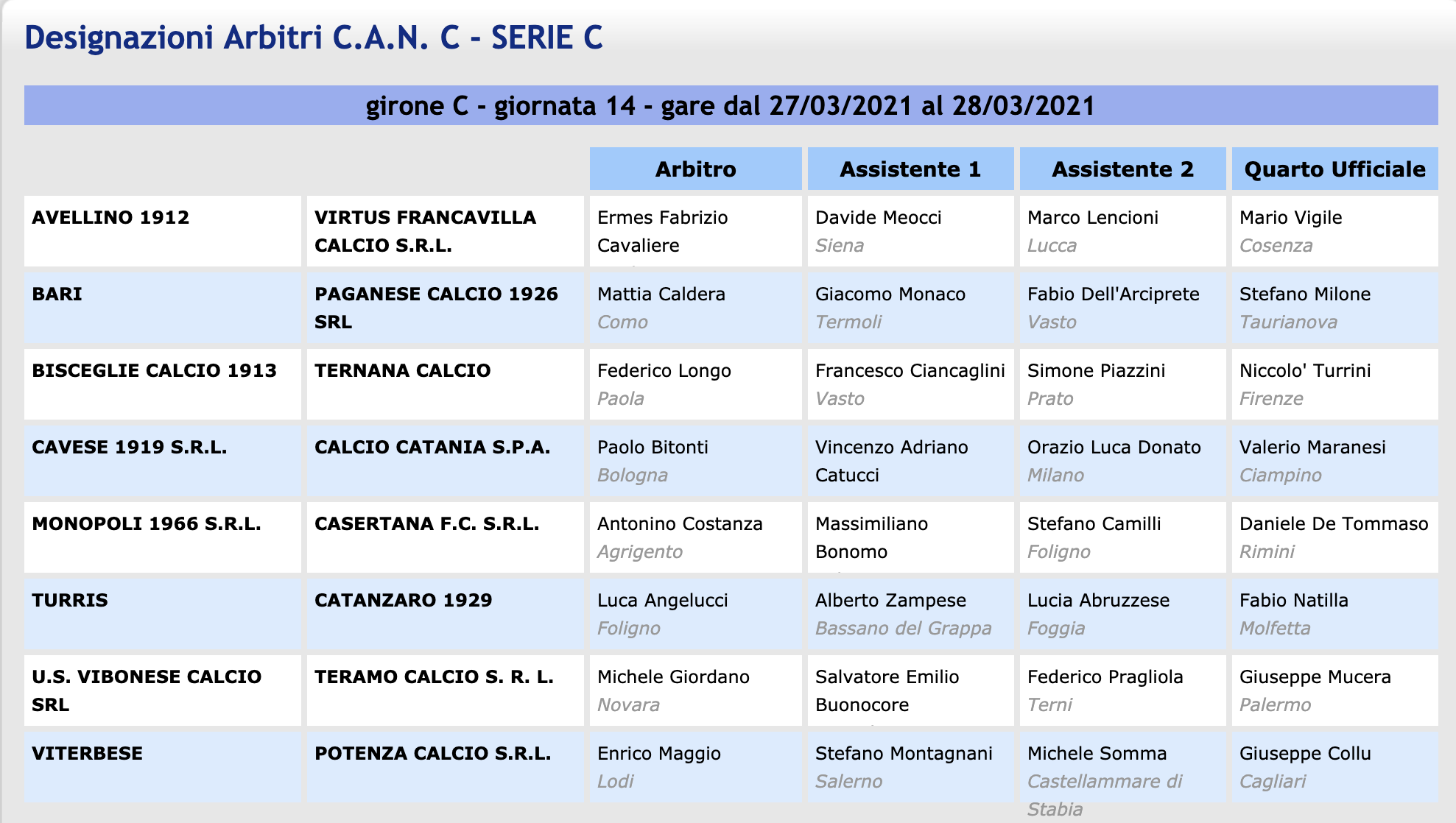 L’AIA ha reso noti i nominativi degli Arbitri, degli Assistenti e dei IV Ufficiali che dirigeranno le gare valide per la 33a giornata (14a di ritorno) del Campionato di Serie C, Girone C, 2020/21. Non è stato ancora deciso chi dirigerà l’incontro fra Palermo e Foggia, in programma lunedì 29 marzo. (NELLA FOTO IN ALTO IL RIEPILOGO)