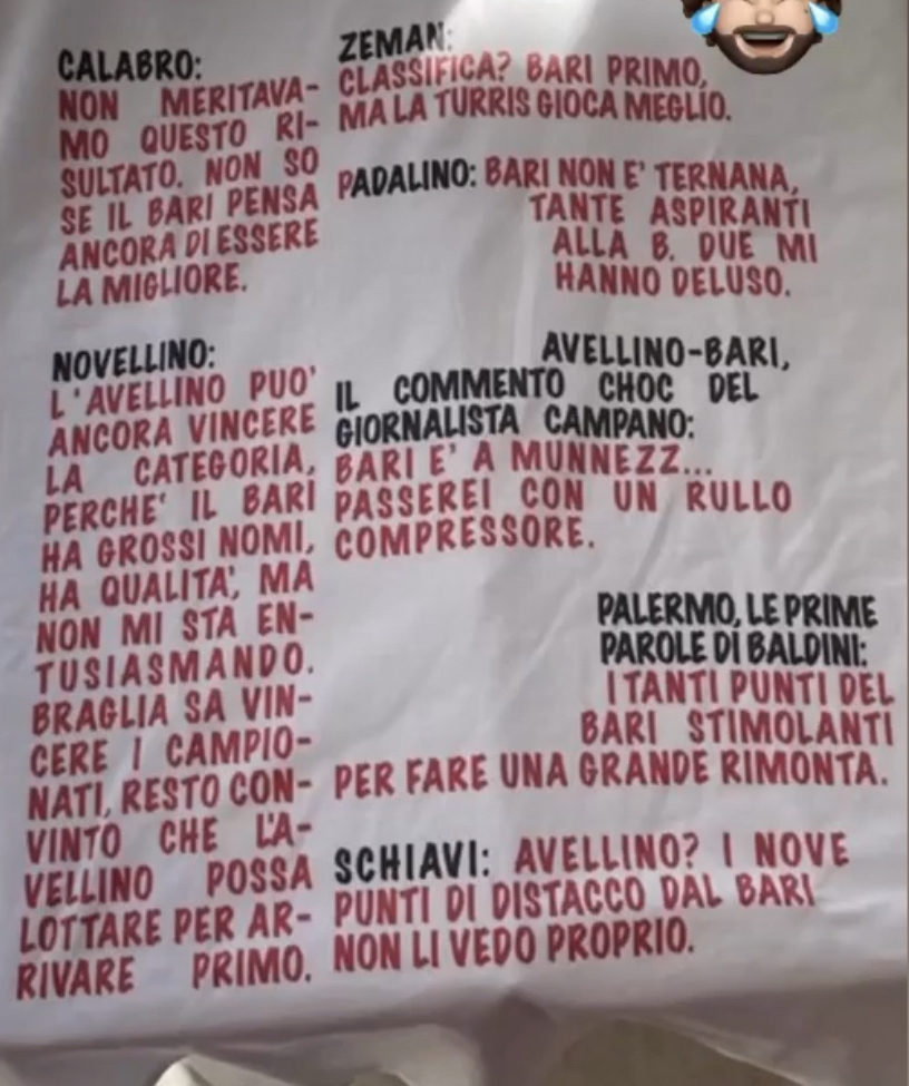 Il Bari ha festeggiato con un pizzico di sarcasmo la promozione in Serie B. Alcuni giocatori hanno infatti una maglia con le dichiarazioni di alcuni allenatori avversari e addetti ai lavori che in un modo o nell’altro non davano i pugliesi come vincenti del torneo.