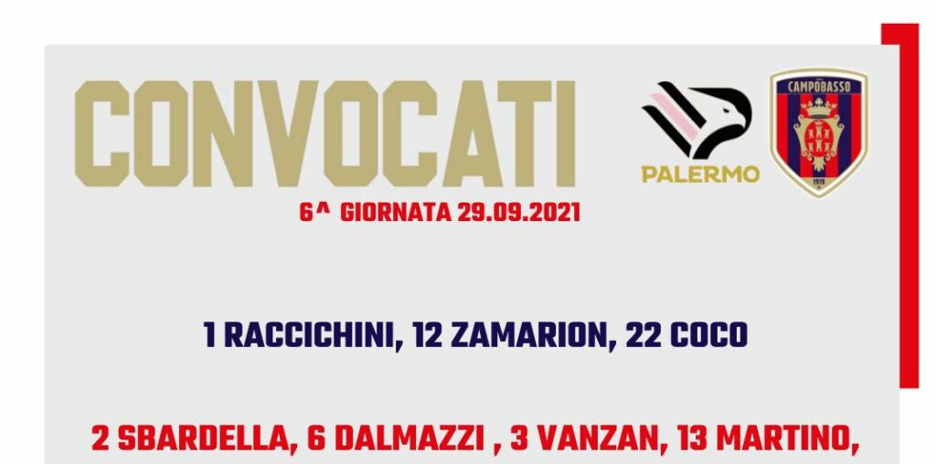 Il Campobasso ha comunicato le scelte dell’allenatore e diramato la lista dei calciatori convocati per la sfida al Barbera contro il Palermo, gara valida per la 6a giornata di Serie C. Sono in tutto 24 i giocatori scelti dal tecnico. In alto l’elenco completo.