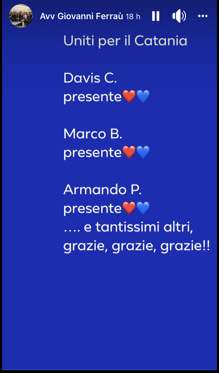 Ad annunciarlo è stato l’avvocato Giovanni Ferraù, in una storia pubblicata su Facebook. Il presidente della Sigi ha ringraziato gli ex Catania: Biagianti, che ha giocato 148 con gli etnei, Curiale, attaccante del Catanzaro, cresciuto anche nelle giovanili del Palermo, e Cicchetti, con i rossazzuri dal 1995 al 1999.