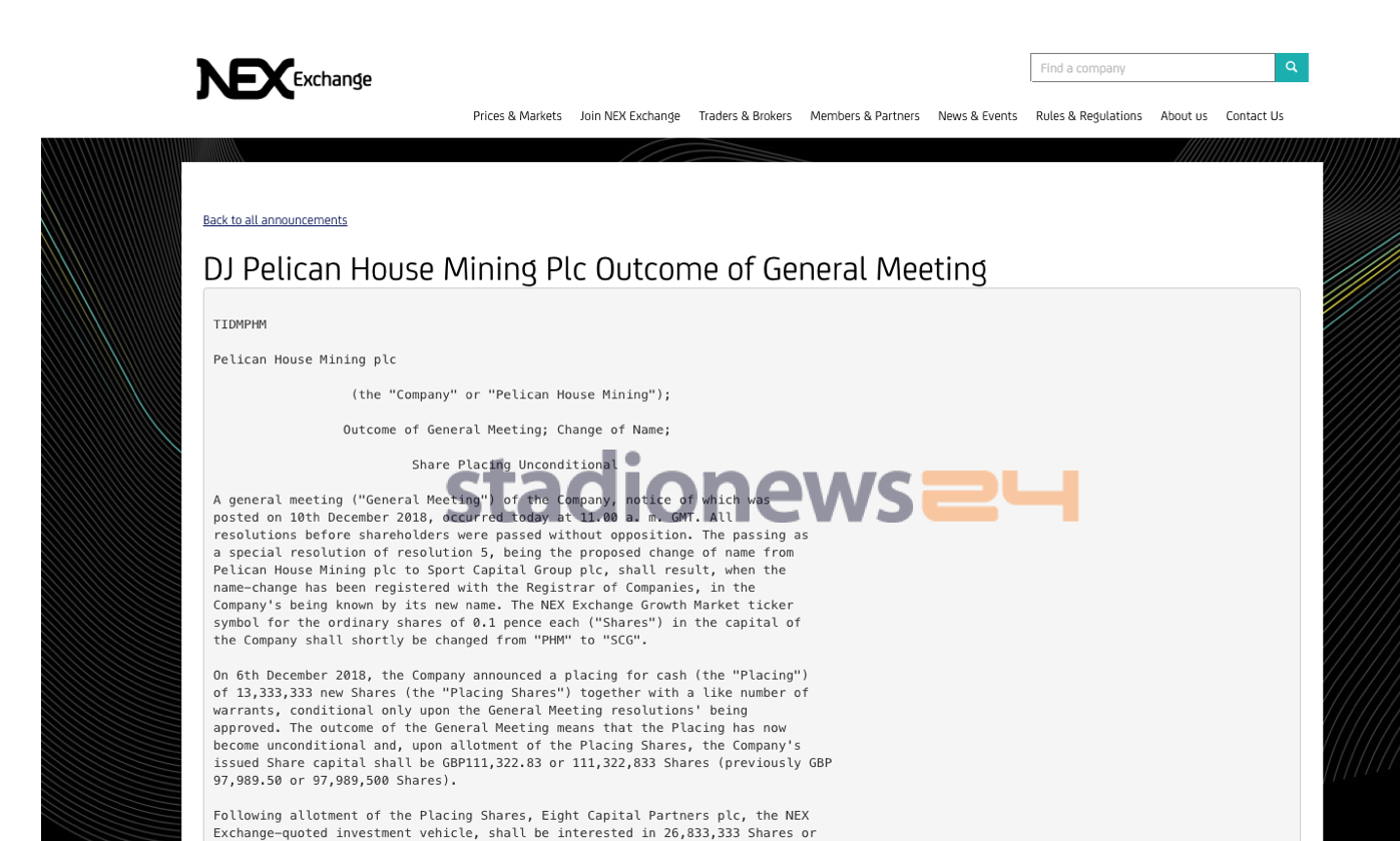 Come si legge nel comunicato (a firma Simon Grant-Rennick – chairman del Board), l’incontro avvenuto negli uffici londinesi della Peterhouse Capital Limited (advisor del fondo di Treacy, Eight Capital) ha deliberato tutte le risoluzioni all’ordine del giorno, compreso il cambio di nome in Sport Capital Group plc, denominazione che risulterà definitivamente anche in borsa una volta che il cambio di nome sarà effettivamente registrato.