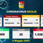 Di seguito il nuovo aggiornamento relativo ai casi di Coronavirus riscontrati nelle varie province della Sicilia: i dati sono aggiornati a oggi (4 maggio 2021), così come segnalati dalla Regione Siciliana all’Unità di crisi nazionale.