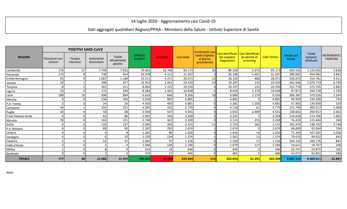 Il Ministero della Salute comunica i dati del nuovo bollettino nazionale sull’emergenza Coronavirus in Italia, aggiornati a oggi martedì 14 luglio.
