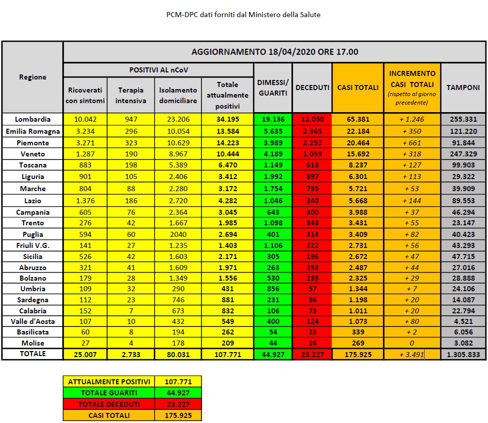 Senza l’ormai consueta conferenza stampa di Angelo Borrelli, la Protezione Civile rende noti i dati aggiornati a sabato 18 aprile 2020:
