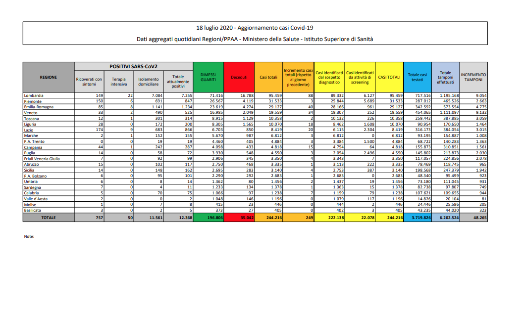 Il Ministero della Salute comunica i dati del nuovo bollettino nazionale sull’emergenza Coronavirus in Italia, aggiornati a oggi sabato 18 luglio.