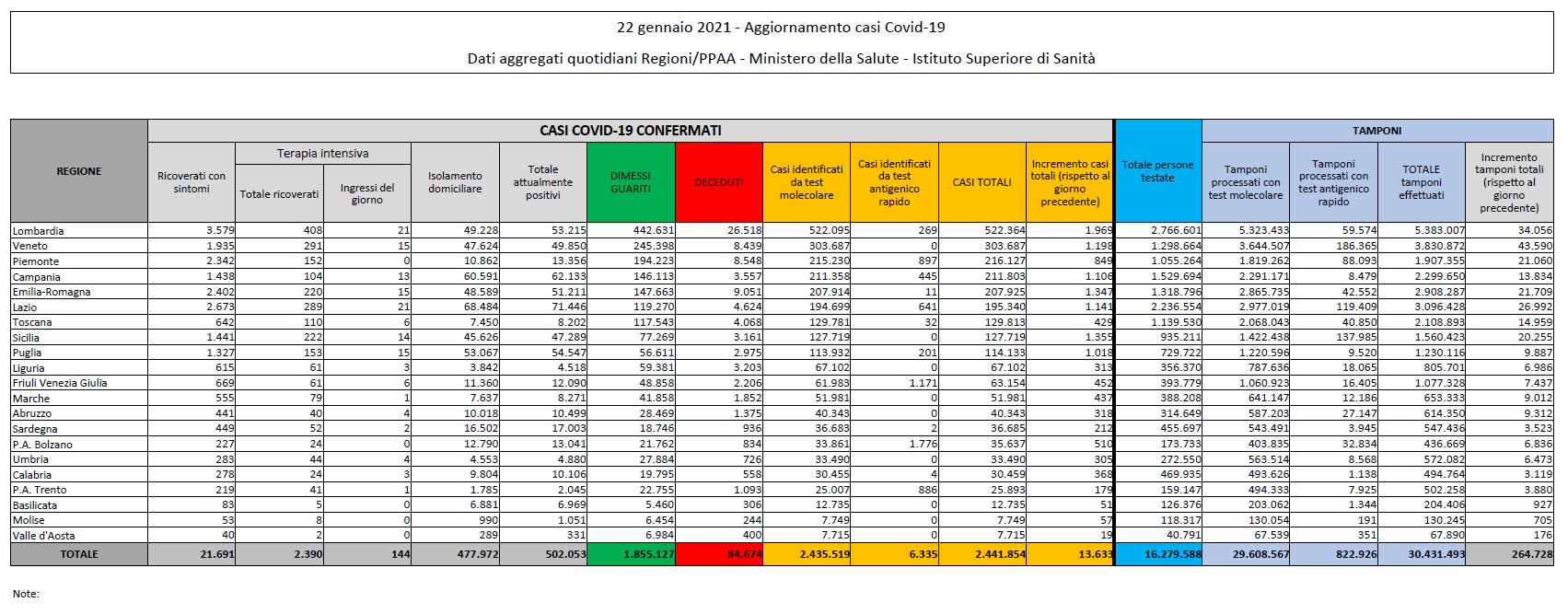Il Ministero della Salute ha comunicato i dati del nuovo bollettino nazionale sull’emergenza Coronavirus in Italia, aggiornati a oggi venerdì 22 gennaio 2021.