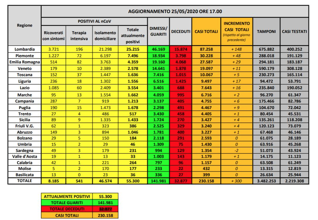 Il Dipartimento della Protezione Civile e il Ministero della salute hanno diffuso il nuovo bollettino con i dati riguardanti l’emergenza nazionale Coronavirus, aggiornati a lunedì 25 maggio.