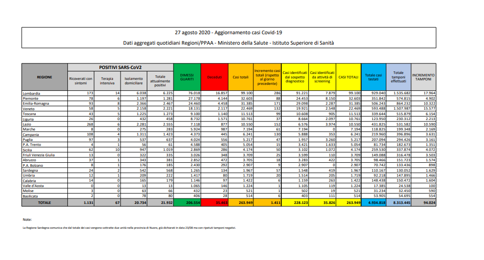 Il Ministero della Salute ha comunicato i dati del nuovo bollettino nazionale sull’emergenza Coronavirus in Italia, aggiornati a oggi giovedì 27 agosto.