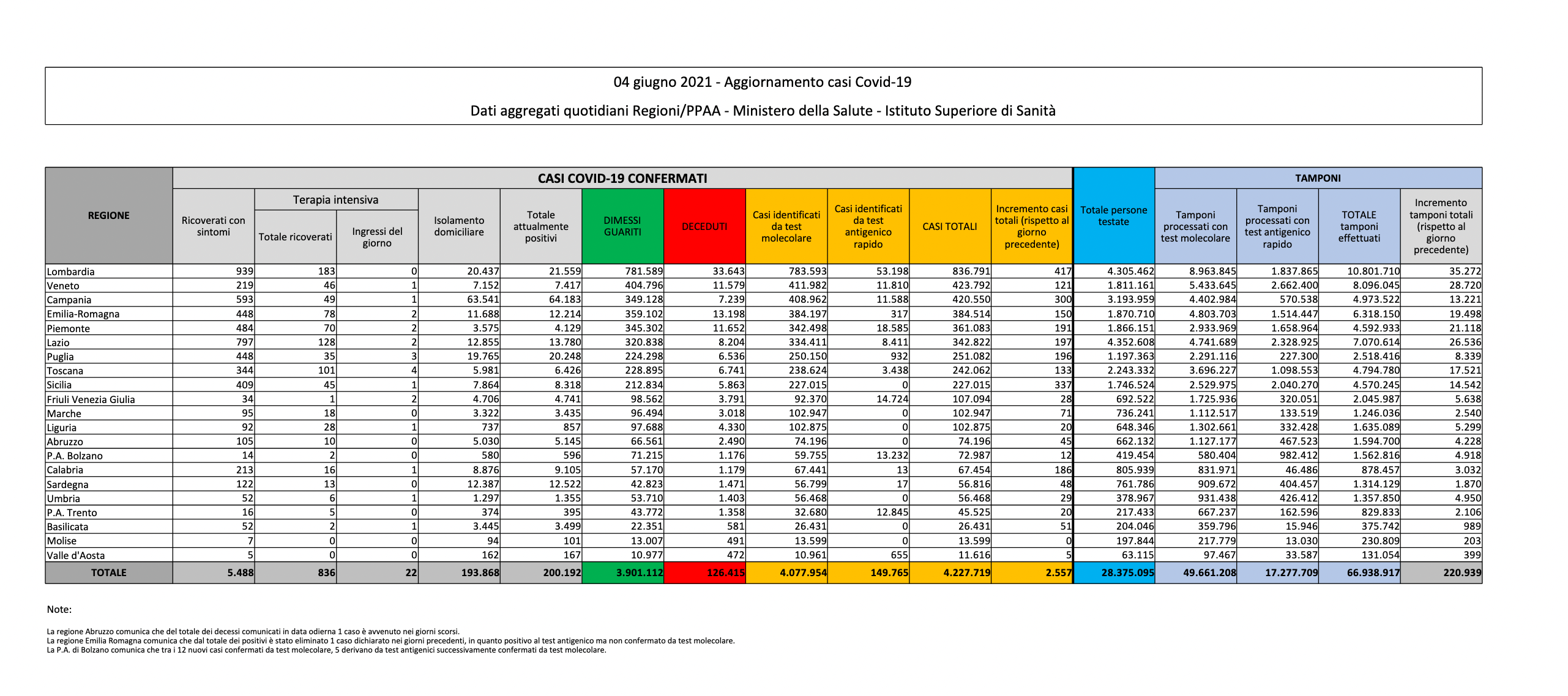 Il Ministero della Salute ha comunicato i dati del nuovo bollettino nazionale sull’emergenza Coronavirus in Italia, aggiornati a oggi venerdì 4 giugno 2021.