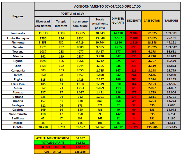 • Deceduti: 17.127 (+604, +3,7%)