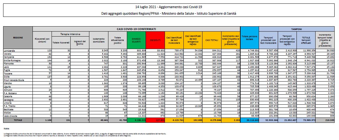 Di seguito i dati Covid e il quadro riepilogativo della situazione in Sicilia, aggiornato a oggi mercoledì 14 luglio, in merito all’emergenza Coronavirus così come comunicato dalla Regione Siciliana all’Unità di crisi nazionale.