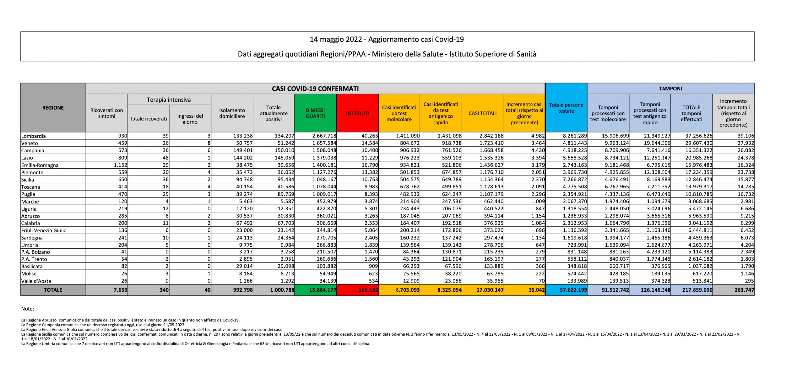 Ecco i dati Covid e il quadro riepilogativo della situazione in Sicilia, aggiornato a oggi (sabato 14 maggio 2022) in merito all’emergenza Coronavirus. I dati vengono divulgati dal Ministero della Salute, così comunicati dalla Regione Siciliana all’Unità di crisi nazionale.