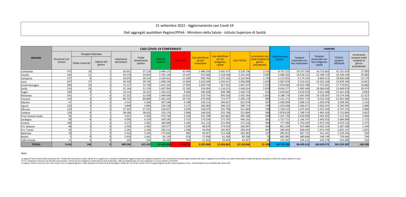 Ecco i dati Covid e il quadro riepilogativo della situazione in Sicilia, aggiornato a oggi (mercoledì 21 settembre 2022) in merito all’emergenza Coronavirus. I dati vengono divulgati dal Ministero della Salute, così comunicati dalla Regione Siciliana all’Unità di crisi nazionale.