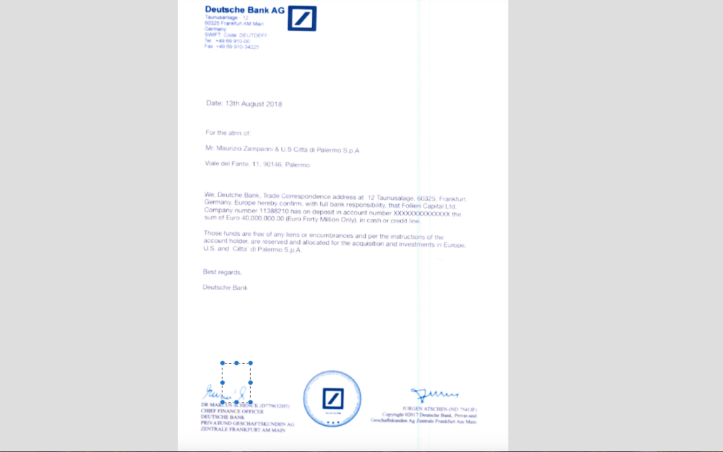 La lettera (indirizzata alla sede del club in Viale del Fante) che contiene anche un errore ortografico (Deutche Bank al posto di Deutsche Bank), conferma in sostanza che la compagnia Follieri Capital Ltd, numero 11388210, ha depositato sul conto la somma di quaranta milioni di euro, in contanti o linea di credito. “I fondi sono esenti da ogni privilegio o vincolo e su istruzioni del titolare del conto sono riservati e allocati per l’acquisizione e gli investimenti in Europa, Stati Uniti e Città di Palermo SpA”.