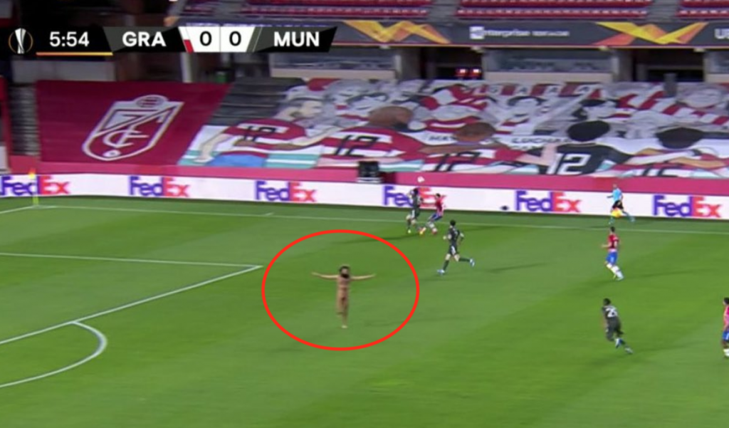 Una scena da non credere durante Granada – Manchester United (andata dei quarti di Europa League). Un uomo – completamente nudo – è entrato in campo al sesto minuto del match, che si gioca a porte chiuse.