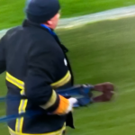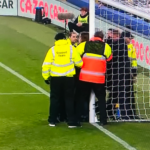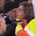 Intorno al 10′ della ripresa, il soggetto non solo è entrato in campo… ma si è anche legato a un palo di una delle due porte stringendosi una fascetta all’altezza del collo: indossava una maglia per sensibilizzare il pubblico sui cambiamenti climatici. Il modo in cui si è legato alla porta ha costretto gli addetti al campo a correre in campo con una cesoia per slegarlo e condurlo fuori dal terreno di gioco. La partita è ripresa solo dopo una decina di minuti.
