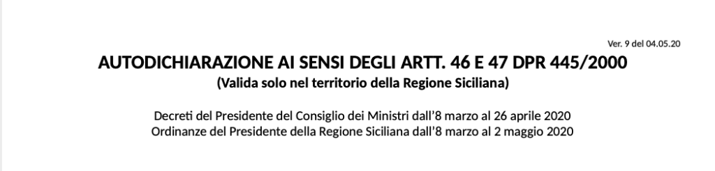 Oltre a quella nazionale, valida anche per lo spostamento tra le Regioni, è stata definitiva anche l’autocertificazione valida solo all’interno del territorio siciliano, seguendo le ordinanze del presidente, Nello Musumeci.