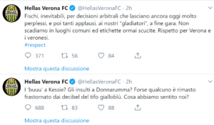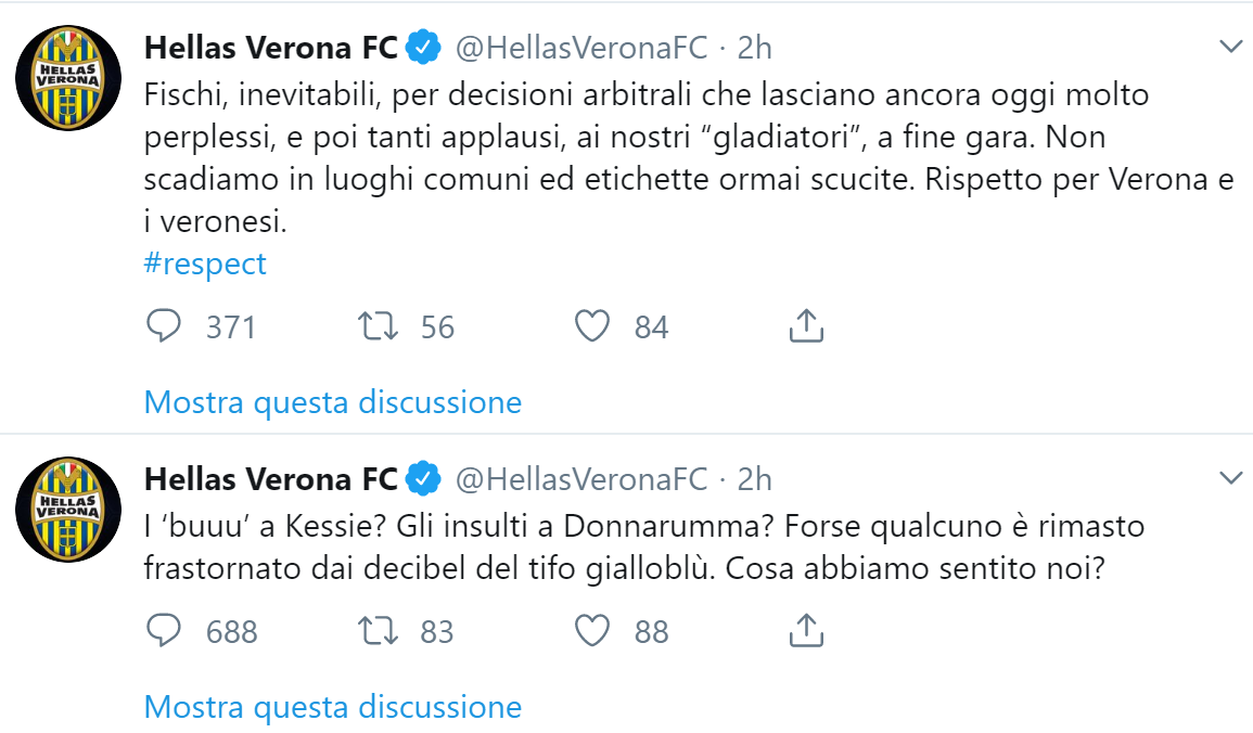 Il club infatti minimizza l’accaduto: “I ‘buuu’ a Kessie? Gli insulti a Donnarumma? Forse qualcuno è rimasto frastornato dai decibel del tifo gialloblù. Cosa abbiamo sentito noi?”. Poi in un tweet immediatamente successivo il Verona aggiunge: “Fischi, inevitabili, per decisioni arbitrali che lasciano ancora oggi molto perplessi, e poi tanti applausi, ai nostri “gladiatori”, a fine gara. Non scadiamo in luoghi comuni ed etichette ormai scucite. Rispetto per Verona e i veronesi”.