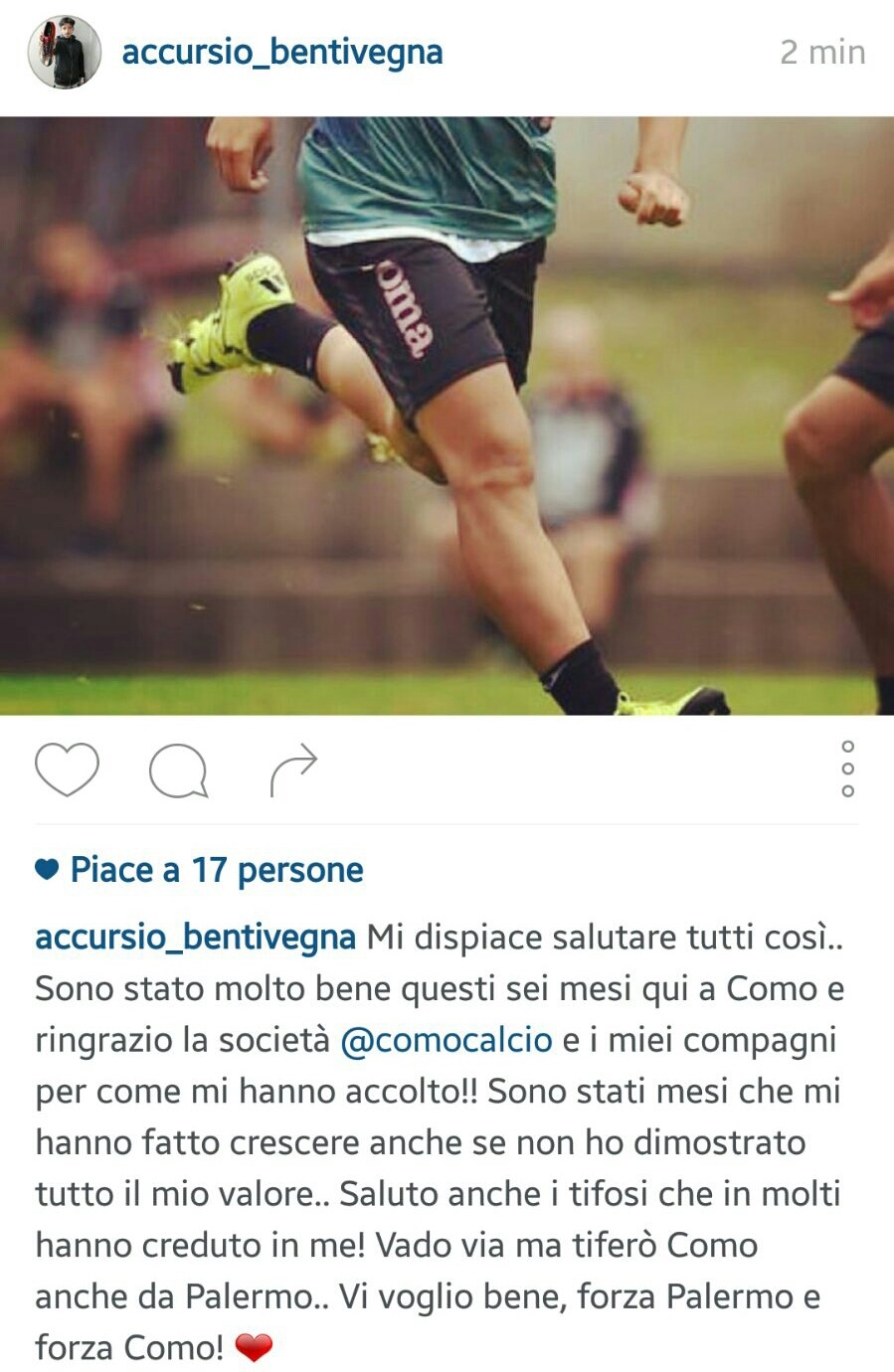 Il Palermo è pronto a riabbracciare Accursio Bentivegna: il club rosanero ha richiamato l’attaccante siciliano dal prestito al Como. Il giocatore ha voluto salutare via Instagram il club lariano e tutti i suoi tifosi: “Mi dispiace salutare tutti così. Sono stato molto bene questi sei mesi qui a Como e ringrazio la società e i miei compagni per come mi hanno accolto. Sono stati mesi che mi hanno fatto crescere anche se non ho dimostrato tutto il mio valore. Saluto anche i tifosi che hanno creduto in me. Vado via ma tiferò Como anche da Palermo. Vi voglio bene, forza Palermo e forza Como”.