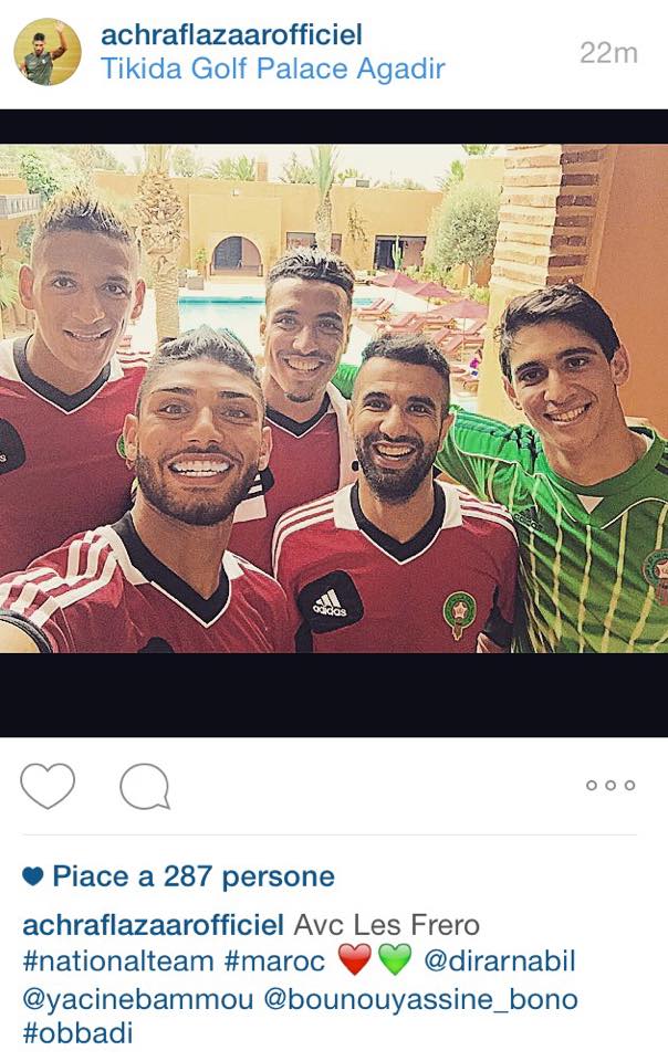 Il commissario tecnico della Nazionale del Marocco Badou Zaki ha convocato Achraf Lazaar per la sfida valida per le qualificazioni alla prossima Coppa d’Africa contro il São Tomé, in programma il 5 settembre. Il terzino del Palermo ha condiviso su Instagram una foto che lo ritrae insieme ad alcuni compagni di squadra nel ritiro della nazionale marocchina.