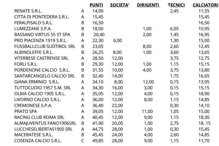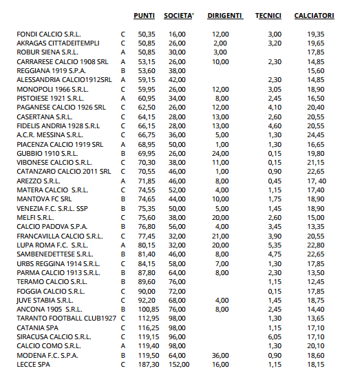 Quest’anno a classificarsi al primo posto è la Renate, società del girone A con appena 14 punti. Completano il podio dei più virtuosi Pontedera e Feralpi Salò.