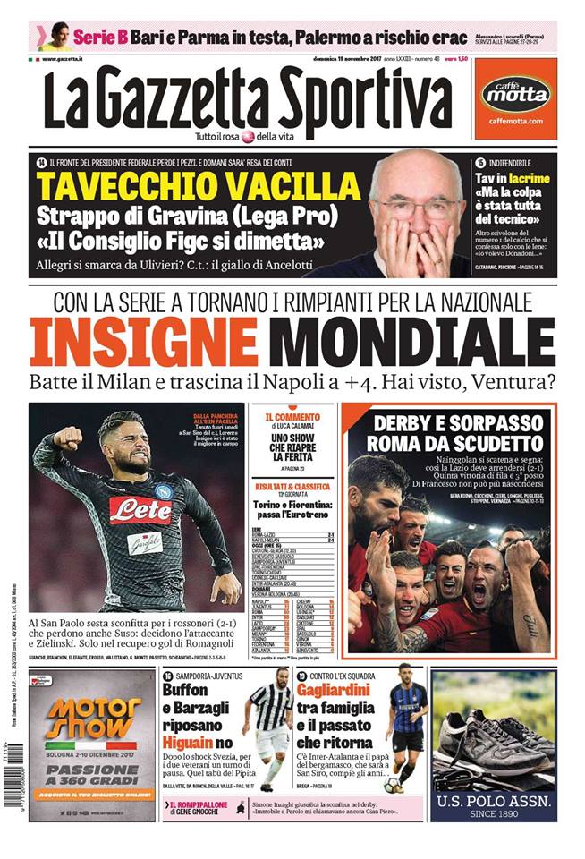 FOTOGALLERY News FOTO – Le prime pagine dei quotidiani, 19 novembre Andrea Fabbricatore 19/11/2017 07:07 Tags: prima pagina gazzetta dello sport, prime pagine giornali sportivi, prime pagine quotidiani sportivi, quotidiani sportivi, rassegna stampa, rassegna stampa foto Continue ReadingPrevious Napoli – Milan 2 – 1, LE PAGELLE: Ventura, hai visto Insigne?Next Gds – Zamparini e lo “spettro” del 1986, quando Palermo salutò il calcio COMMENTA / VAI AI COMMENTILascia un commento Annulla rispostaIl tuo indirizzo email non sarà pubblicato. I campi obbligatori sono contrassegnati *Commento * Nome * Email * Sito web Salva il mio nome, email e sito web in questo browser per la prossima volta che commento. Δ
