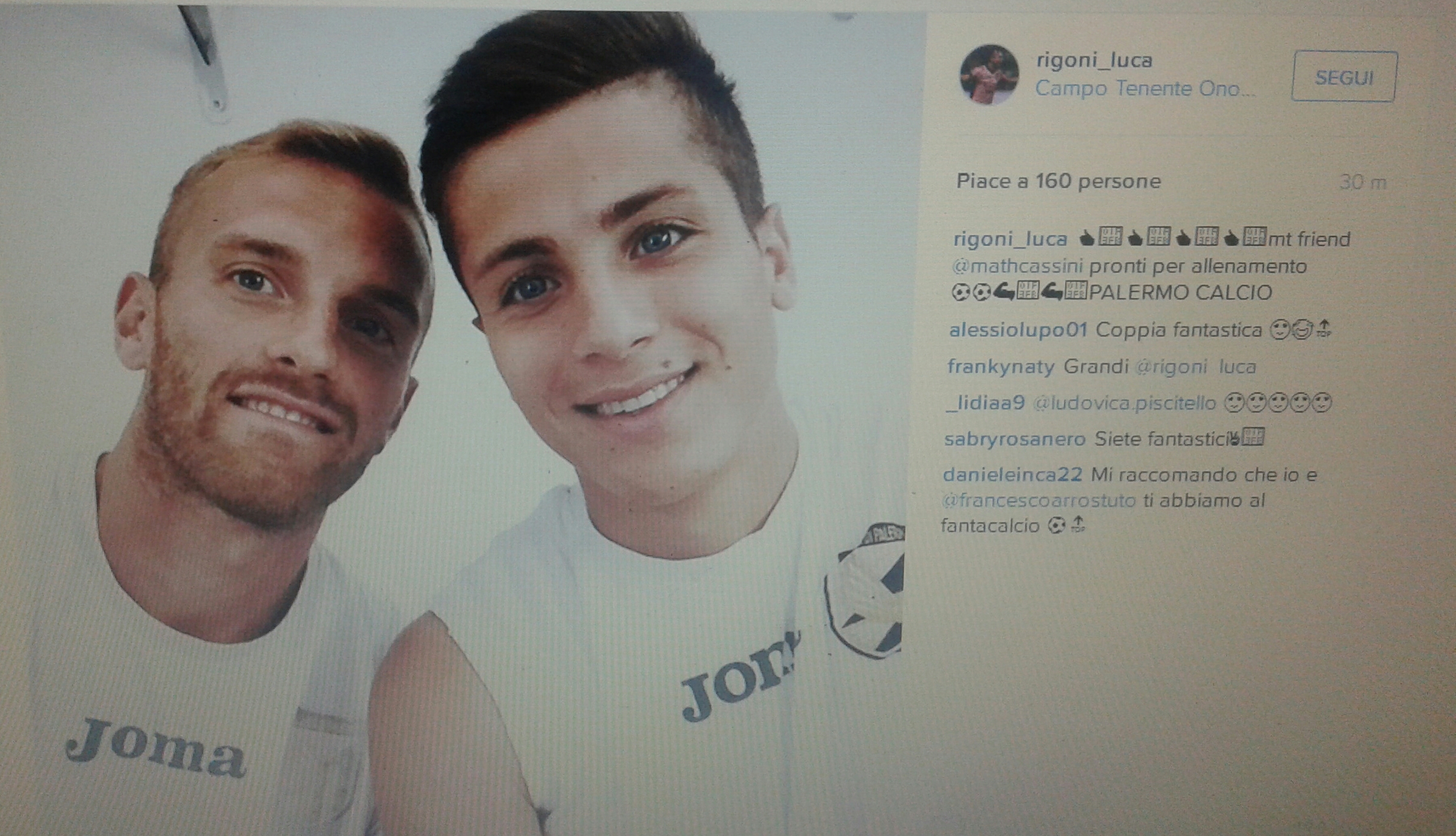 Il Palermo di Giuseppe Iachini si appresta a scendere sul terreno di gioco del “Tenente Onorato” di Boccadifalco per svolgere la seduta pomeridiana programmata per oggi. La squadra rosanero sta proseguendo la preparazione in vista della partita contro il Carpi, valevole per la 3a giornata del campionato di Serie A Tim 2015/2016, in programma domenica 13 settembre alle ore 15.00 allo stadio “Renzo Barbera”. Pochi istanti fa il centrocampista rosanero Luca Rigoni ha condiviso sul suo profilo Instagram una foto che lo ritrae in compagnia del giovane attaccante brasiliano Matheus Cassini, prima dell’inizio della seduta.