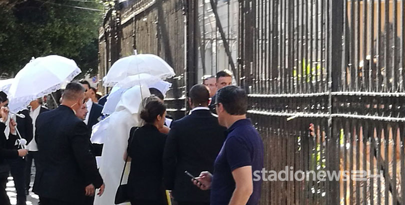 Il forte centravanti della Nazionale non gioca più a Palermo è vero, ma come dimenticarlo? E poi il fatto che si sia innamorato anche lui come tanti altri giocatori (Pastore, per esempio), di una nostra concittadina non può che renderci orgogliosi. Ecco perché un centinaio di tifosi, curiosi e affettuosi, sfidando il caldo di un pomeriggio particolarmente afoso, si è sistemato dietro le transenne allestite davanti la Chiesa prescelta, circondata da improbabili bodyguard di nero vestiti e con ridicoli ombrellini bianchi pronti per l’uso, per festeggiare gli sposi e partecipare per pochi minuti alla loro gioia.