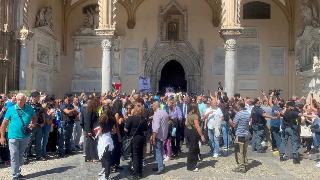 ore 11.10: Palermo risponde presente, già gremita la Cattedrale ma anche il sagrato. C’è un grande striscione di tifosi che recita: “Ciao Totò, figlio di Palermo”.
