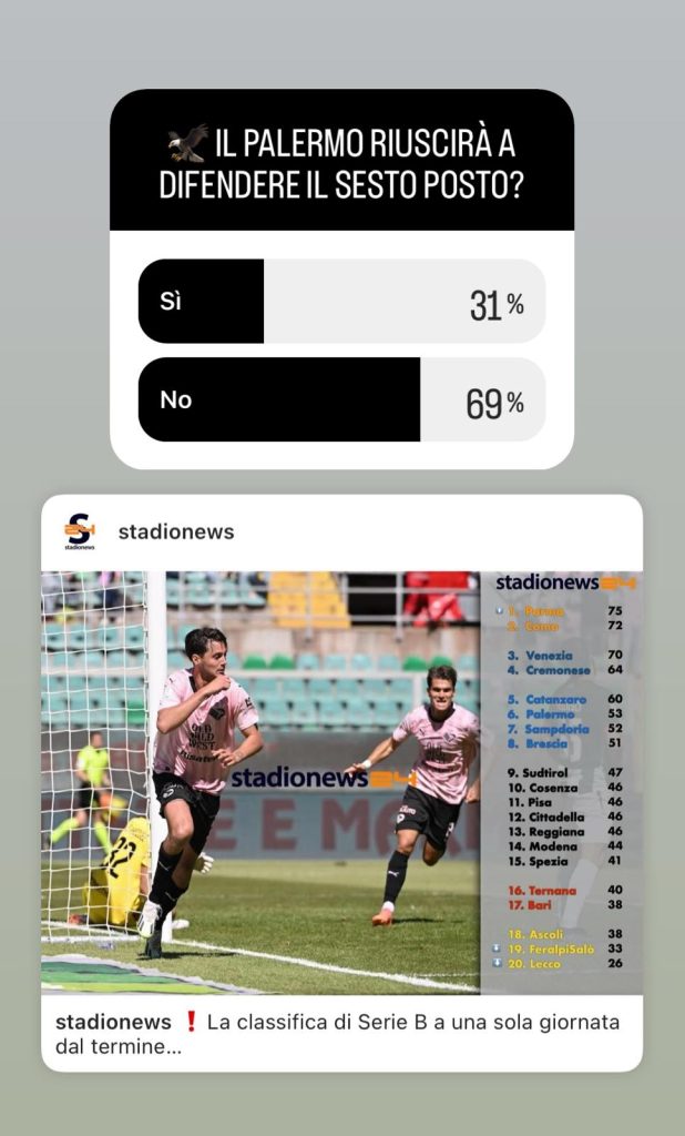 Il Palermo giocherà i playoff ma il sesto posto è tutt’altro che sicuro, i rosanero hanno solo un punto di vantaggio sulla Sampdoria settima e due sul Brescia ottavo a una sola giornata dal termine. Sulla pagina Instagram di Stadionews è stato proposto un sondaggio ai tifosi: il Palermo riuscirà a difendere il sesto posto?