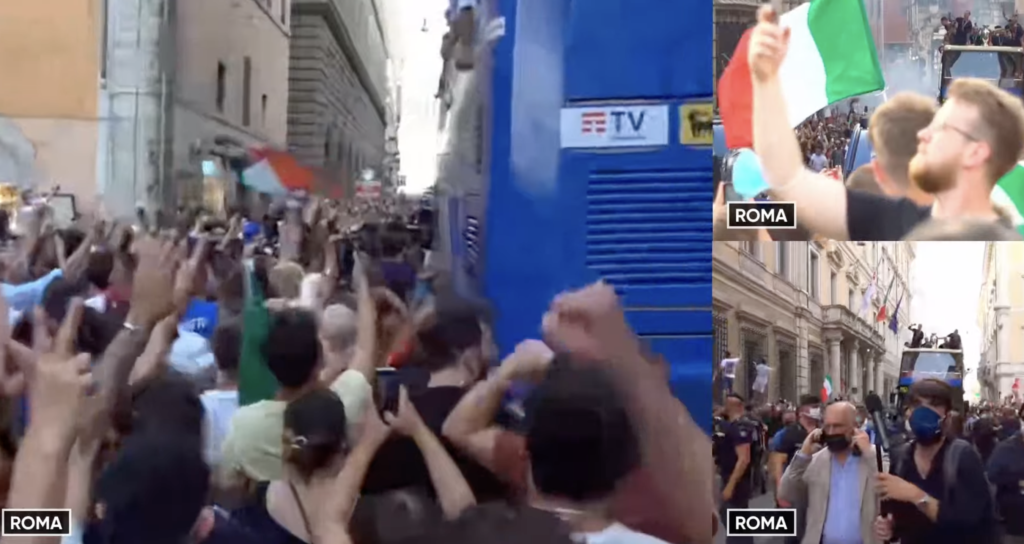 Dopo l’incontro con Draghi, la squadra è salita a bordo del pullman scoperto riportando in strada un altro bagno di folla. Anche Berrettini sul pullman dell’Italia. Bonucci e Sirigu subito scatenati, sono loro ad alzare la coppa provocando i cori dei tifosi. Il giro d’onore, inizialmente non previsto e richiesto espressamente dai calciatori, ha attraversato le strade che conducono all’albergo dove alloggiano i reduci di Wembley. Via del Corso, Piazza Venezia e Piazza Barberini alcuni dei luoghi attraversati.