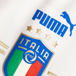 Gli Azzurri onorano il Tricolore. La maglia bianca si accende con grafiche audaci e dettagli che si ispirano con orgoglio ai colori della bandiera nazionale. Le rifiniture dorate rendono omaggio all’età calcistica d’oro dell’Italia.