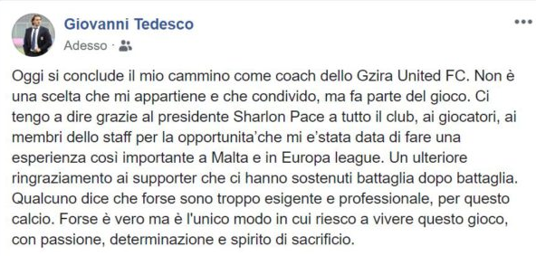Sul suo profilo Facebook scrive: “Oggi si conclude il mio cammino come coach dello Gzira United FC. Non è una scelta che mi appartiene e che condivido, ma fa parte del gioco. Ci tengo a dire grazie al presidente Sharlon Pace a tutto il club, ai giocatori, ai membri dello staff per la opportunità che mi è stata data di fare una esperienza così importante a Malta e in Europa league. Un ulteriore ringraziamento ai supporter che ci hanno sostenuti battaglia dopo battaglia. Qualcuno dice che forse sono troppo esigente e professionale, per questo calcio. Forse è vero ma è l’unico modo in cui riesco a vivere questo gioco, con passione, determinazione e spirito di sacrificio”.