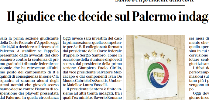 Nel pezzo, tra l’altro, è scritto che “il collegio sarà formato dal presidente della Corte federale d’appello Sergio Santoro, come in occasione della riunione di giovedì scorso, dal presidente della prima sezione Gianpiero Paolo Cirillo, dal vice presidente Salvatore Mezzacapo e dai componenti Ivan De Musso, Gabriele De Sanctis, Umberto Maiello e Laura Vasselli. Il presidente Santoro è finito insieme ad altri trenta indagati, fra i quali l’ex ministro Saverio Romano e l’ex presidente della regione siciliana Raffaele Lombardo, al centro degli accertamenti sui presunti casi di corruzione al Consiglio di Stato: proprio dell’organo di rilievo costituzionale Santoro era fra i candidati più autorevoli al ruolo di presidente, incarico poi assegnato a Filippo Patroni Griffi. A gennaio la procura di Roma ha chiesto altri sei mesi di indagini sul procedimento che viaggia in parallelo con quello aperto dalla procura di Messina in cui si ipotizzano episodi di corruzione in atti giudiziari per pilotare sentenze nell’ambito della giustizia amministrativa. I tifosi del Palermo non hanno perso tempo a cercare in rete informazioni sul suo conto e non si contano più i post sui social in cui gli vengono attribuite colpe di ogni tipo”.