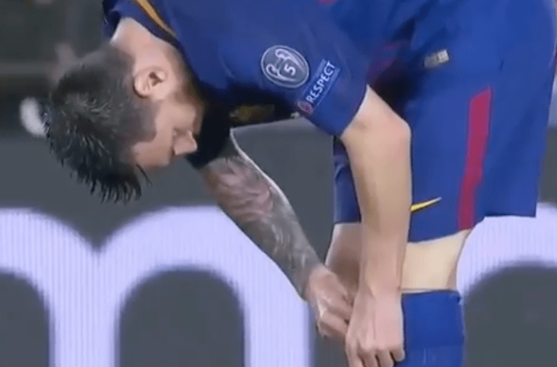 Nascosta nei calzettoni. Lionel Messi non sorprende solo per i 100 gol segnati in carriera nelle coppe europee, ma anche per un curioso episodio che lo vede protagonista di Champions contro l’Olympiacos: improvvisamente spunta un pastiglia bianca.