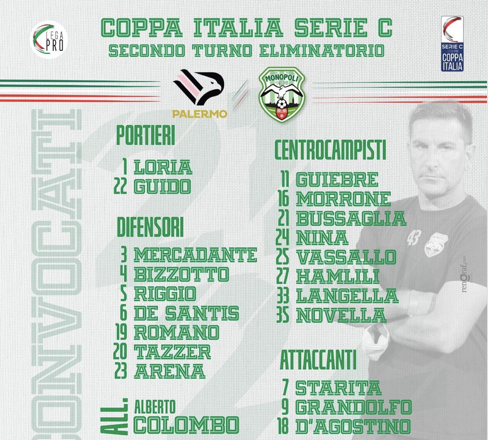 Il tecnico del Monopoli, Alberto Colombo, ha convocato venti giocatori per la trasferta al Barbera di Coppa Italia Serie C, nella quale affronterà il Palermo (QUI i convocati rosanero).