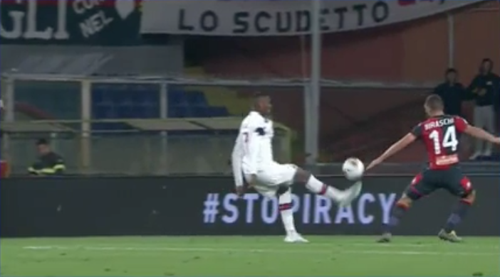 Biraschi copre in diagonale l’incursione di Leao dalla sinistra: nell’incrocio tra i due Biraschi viene saltato e con il braccio sinistro proteso all’indietro intercetta il pallone, impedendogli il tiro. L’azione prosegue ma poi l’arbitro Mariani viene richiamato dal VAR: dopo una consultazione, il responso è calcio di rigore per il Milan (poi trasformato da Kessie) ma è anche rosso diretto.