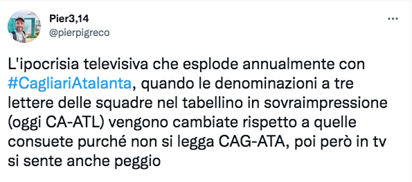 Schermata 2021-11-06 alle 21.18.19 Continue ReadingPrevious Niente “CAG – ATA”, per le tv è tabù: Cagliari – Atalanta diventa “CA – ATL” COMMENTA / VAI AI COMMENTILascia un commento Annulla rispostaIl tuo indirizzo email non sarà pubblicato. I campi obbligatori sono contrassegnati *Commento * Nome * Email * Sito web Salva il mio nome, email e sito web in questo browser per la prossima volta che commento. Δ