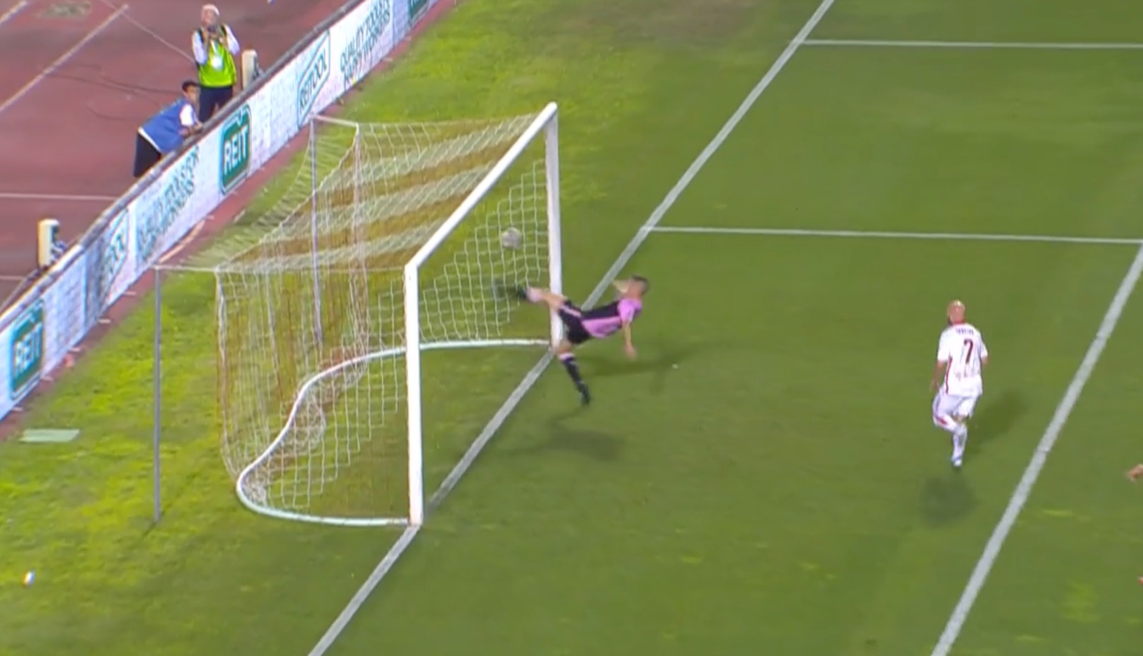 Al 31′ minuto, Marconi tenta di salvare sulla linea la conclusione di Chiricò: il difensore rosanero corre verso la porta e in spaccata scaraventa alla disperata il pallone sulla traversa, ma subito si cerca di capire se il pallone sia completamente entrato prima della deviazione di Marconi. L’arbitro Gualtieri si affida dunque alla valutazione del VAR Di Paolo, ma la decisione può basarsi solo sulle immagini televisive. E nessuna inquadratura sembra avere l’angolazione adatta per prendere una decisione certa.