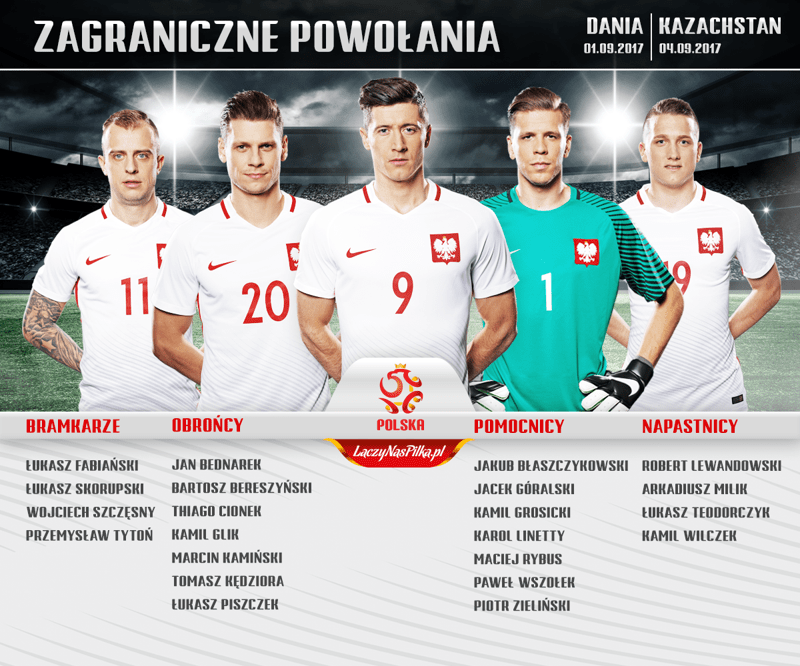 La Nazionale polacca, allenata da Adam Nawalka, affronterà Danimarca e Kazakistan nelle sfide valide per le qualificazioni ai Mondiali di Russia 2018: giorno 1 settembre sfida ai danesi a Copenhagen (ore 20.45), lunedì 4 settembre match in programma allo Stadio Nazionale di Varsavia contro il Kazakistan.
