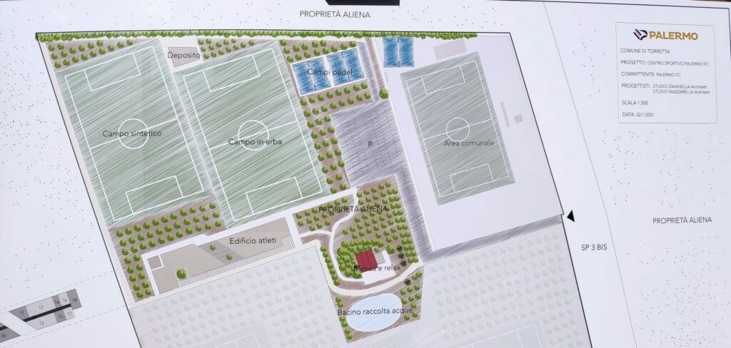 Il Palermo ha il suo progetto per il nuovo centro sportivo che sorgerà a Torretta, realizzato dagli studi Zavanella e Mazzarella. La prima pietra dovrebbe essere posata nell’estate 2021 mentre l’investimento complessivo dovrebbe ammontare a 5,8 milioni di euro.