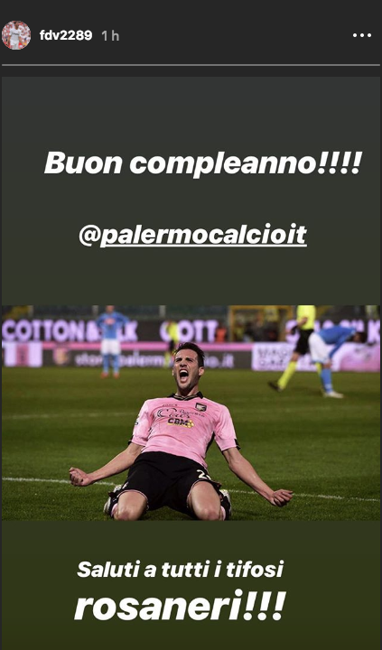 Sulle storie di Instagram scrive: “Buon compleanno Palermo, saluti a tutti i tifosi rosaneri!!”.